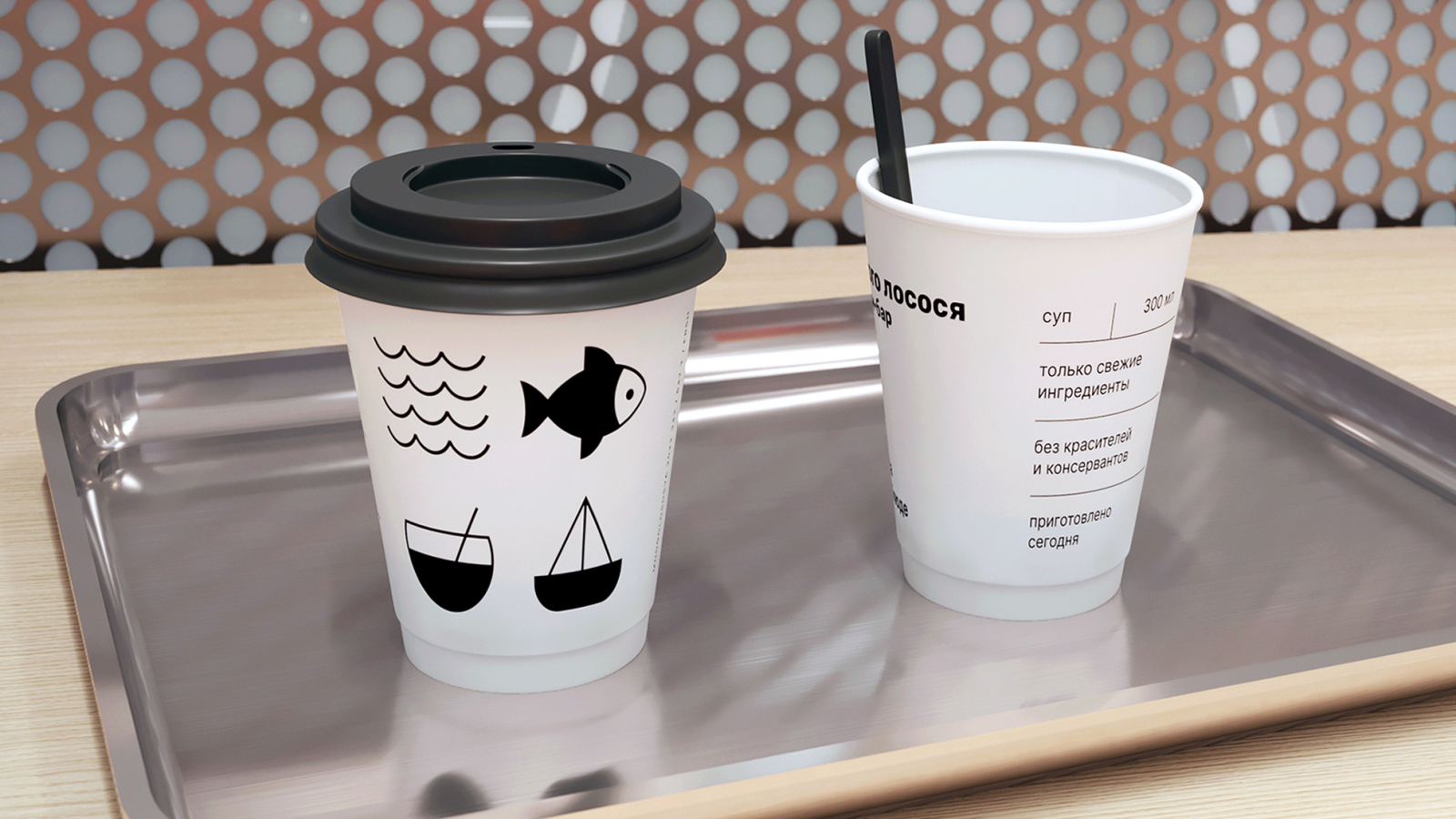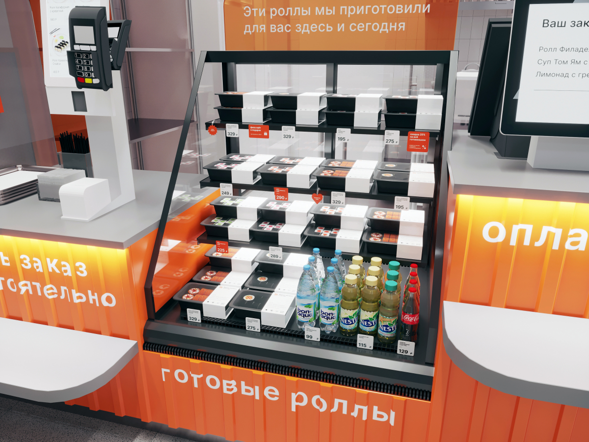Дизайн-решение транслирует скорость, технологичность и налаженность процессов от улова до попадания готового блюда в руки клиента. Через декоративные элементы и материалы отделки дизайнеры дают отсылку к этапам производства, через инфографику и коммуникации рассказывают о процессе логистики и бенефитах, а также используют этот стиль в навигации.