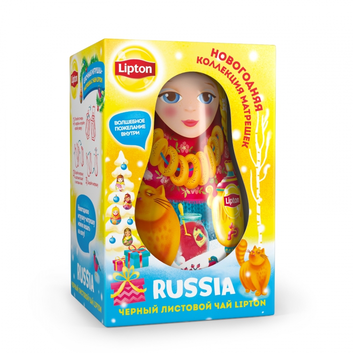 Накануне новогодних праздников компания Unilever выпустила ограниченную серию чая Lipton - промо-упаковку в виде ёлочных игрушек-матрёшек. Идею и дизайн подарочной коллекции разработало брендинговое агентство Depot WPF.