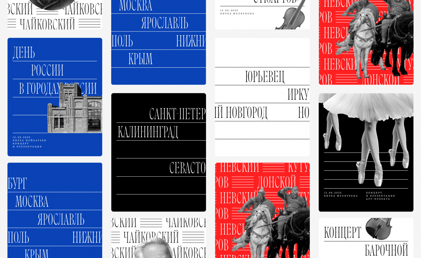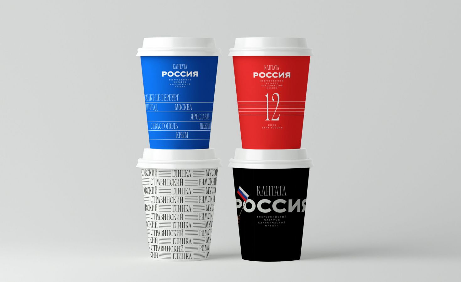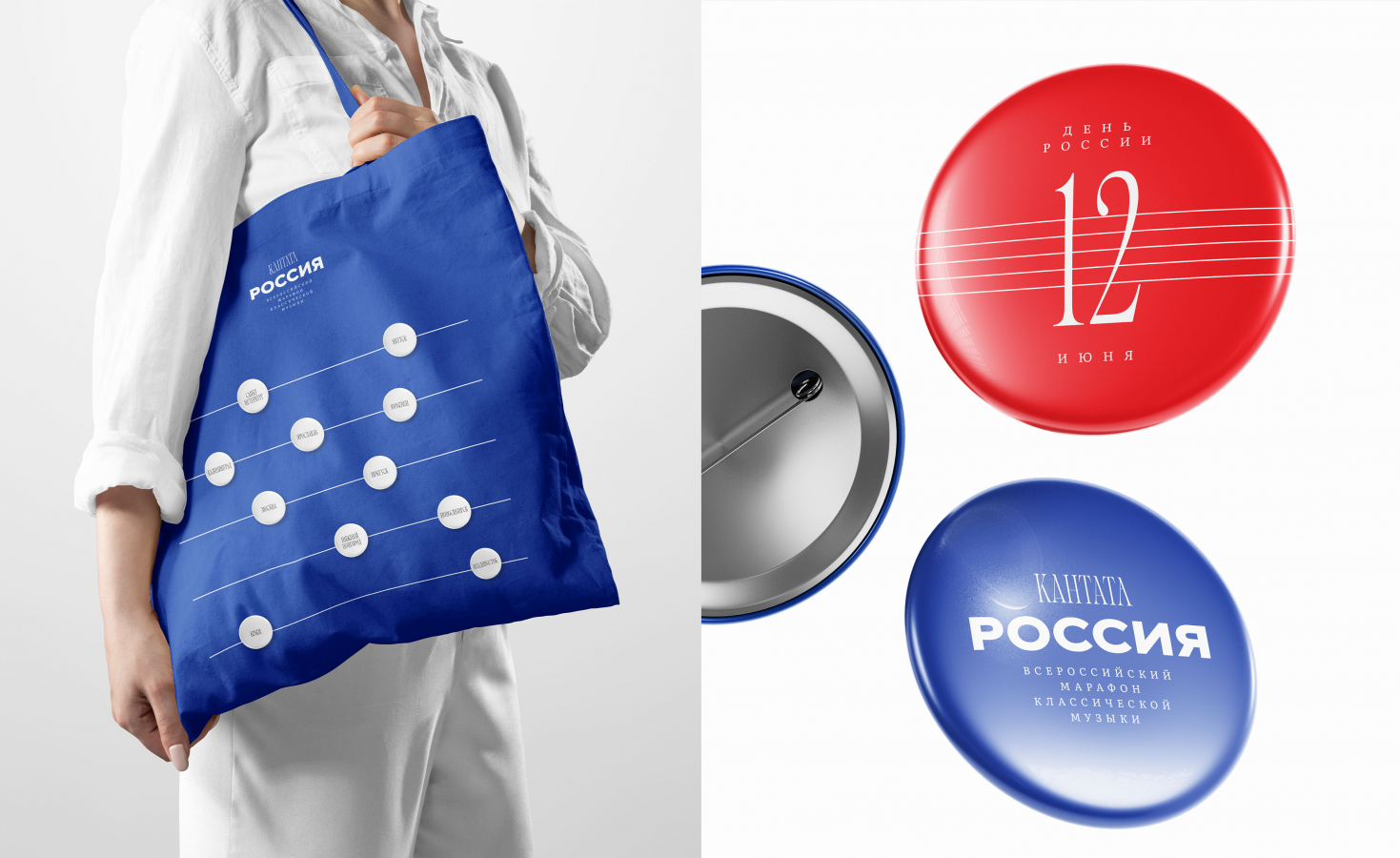 В логотипе тонкая, музыкальная «Кантата» сопровождается размашистой, монументальной «Россией», а на нотном стане — основном графическом элементе бренда — удобно расположились города-участники марафона, которые словно ноты выстроились вдоль линий, образуя ритмичное музыкальное произведение. Общую музыкально-государственную историю поддержало и цветовое решение, которое включало в себя как классическую черно-белую гамму, так и яркую, парадную, состоящую из трех главных цветов страны: белого, синего и красного. Так тема объединения стала основной и прошла тонкой линией через все коммуникационные носители.