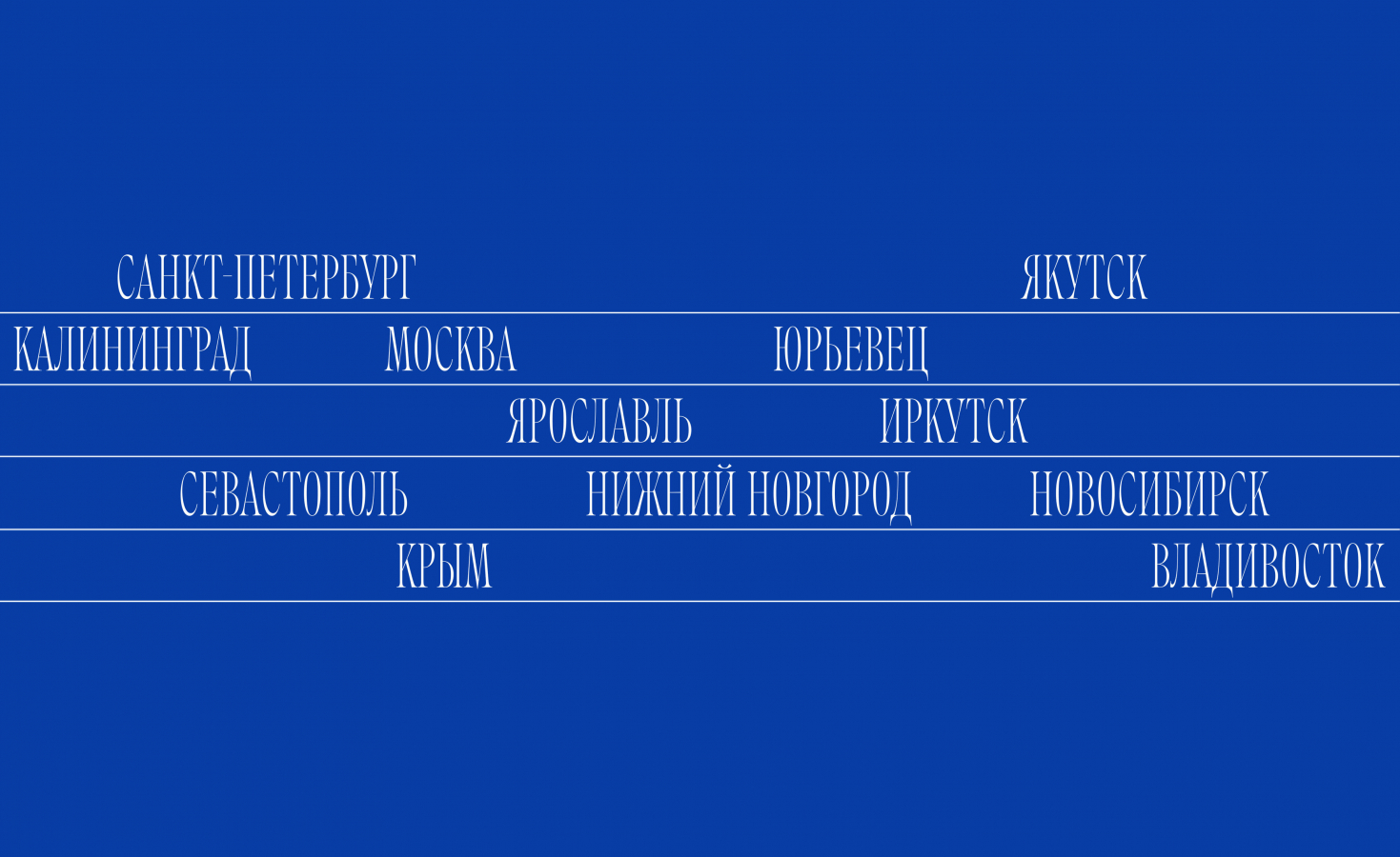 - 12 регионов: Владивосток, Якутск, Иркутск, Новосибирск, Нижний Новгород, Ярославль, Крым, Севастополь, Юрьевец, Калининград, Москва и Санкт-Петербург.