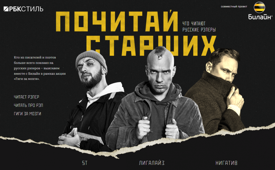Присоединился к проекту и РБК, создав серию видеоперформансов, где рэп-исполнители рассказывают о поэтах и писателях, чьи жизнь и творчество их вдохновляют. В проекте о своем читательском опыте рассказали Лигалайз, ST и Нигатив. В созданных специально для каждого из рэперов декорациях, герои представили произведения российских писателей, повлиявших на их творчество.