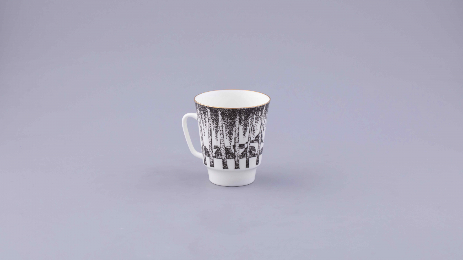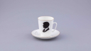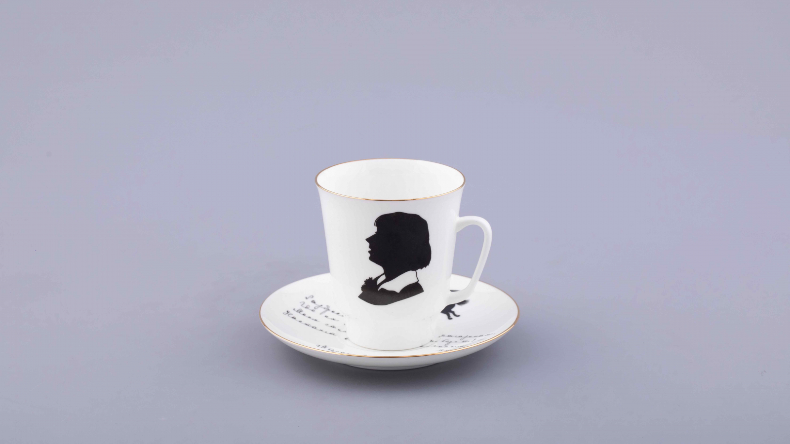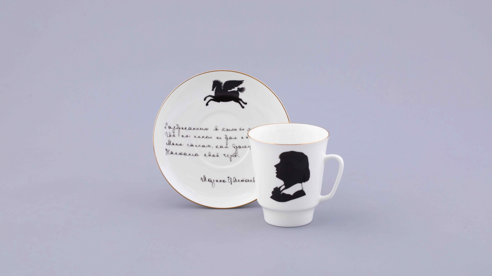 Кофейная пара, посвященная Марине Цветаевой, напротив, оформлена в изысканном стиле с элементами натюрморта. Будучи одной из самых противоречивых, но нежных поэтесс Серебряного века, она вдохновила художника по фарфору на создание уникальной пары. Неслучайно в оформлении использовано пронзительное стихотворение 1913 года — «Моим стихам, написанным так рано».