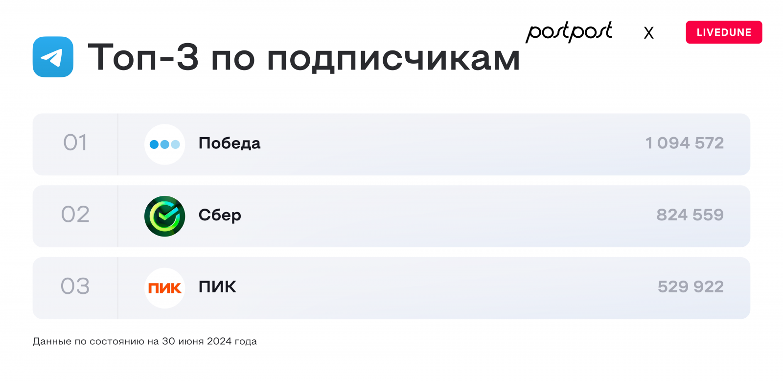 - Подписчики: авиакомпания «Победа» лидирует с более чем 1 млн подписчиков, привлекаемых регулярными распродажами билетов, а «Сбер» показывает стабильный рост, добавив 400 тыс. за счет акций и специальных предложений.