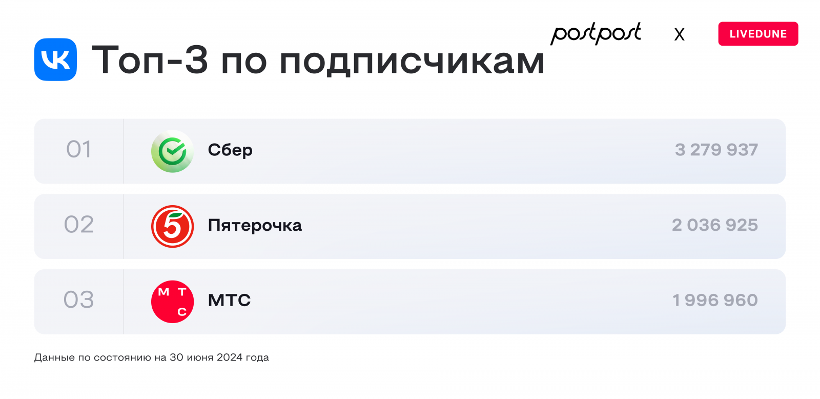 - Лидеры по подписчикам: «Сбер» лидирует с аудиторией более 3,2 млн человек, а «Пятёрочка» и «Магнит» идут следом. Они активно используют «ВКонтакте» для публикаций с мемами и милыми видео.