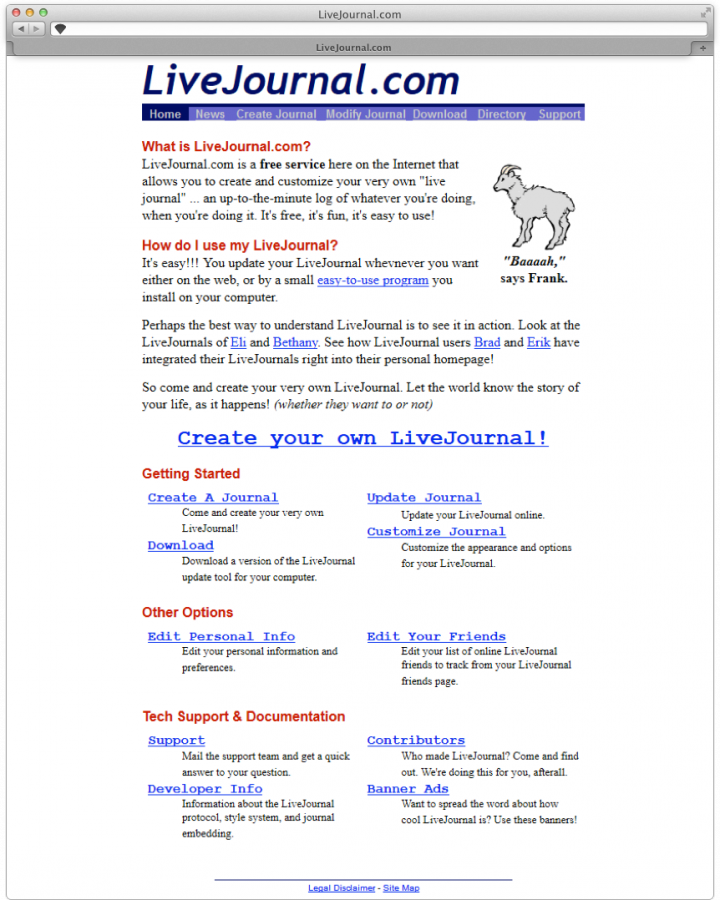 15 апреля «ЖЖшечка» отметила свое 20-летие — именно в этот день американский программист-любитель Бред Фицпатрик зарегистрировал доменное имя LiveJournal.com. Через полгода, в ноябре 1999-го, пользователь at опубликовал первый пост на русском, а у платформы появился собственный маскот — козел по имени Фрэнк. Свой первый логотип, автором которого стал Джаретт Хэзер, LiveJournal обрел в 2000 году, а к концу года пользователи уже могли вступать в первые сообщества.