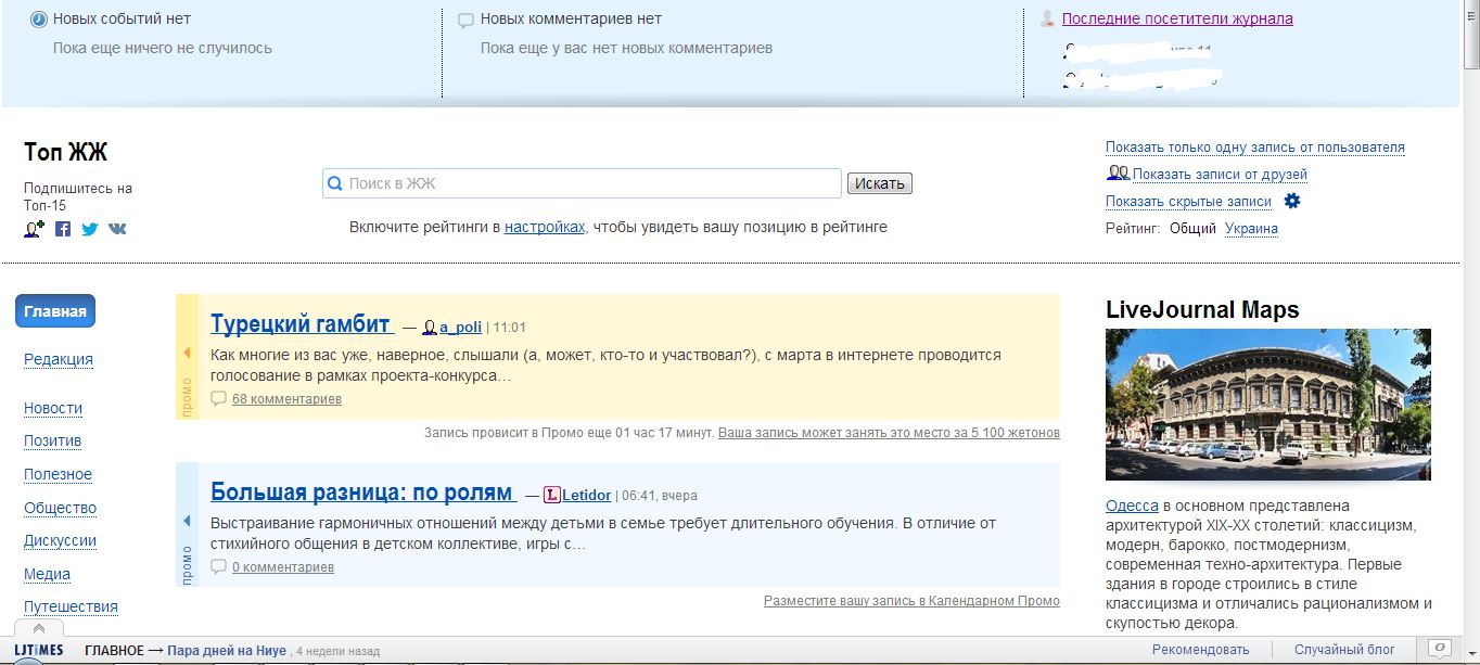 Теперь на главной странице появились тематические категории записей: «Новости», «Позитив», «Полезное», «Общество», «Дискуссии», «Медиа», «Путешествия», «18+», «ЖЫР» (развлекательные посты). Отбором записей в рубрики занимается команда редакторов. Один и тот же пост может попасть как в общий рейтинг, так и в тематический. Например, в «Путешествиях» запись попадет на первое место, а в основном – на 32-е. Блоги в категории «18+» будут участвовать только в своей рубрике и в основной рейтинг не попадут.