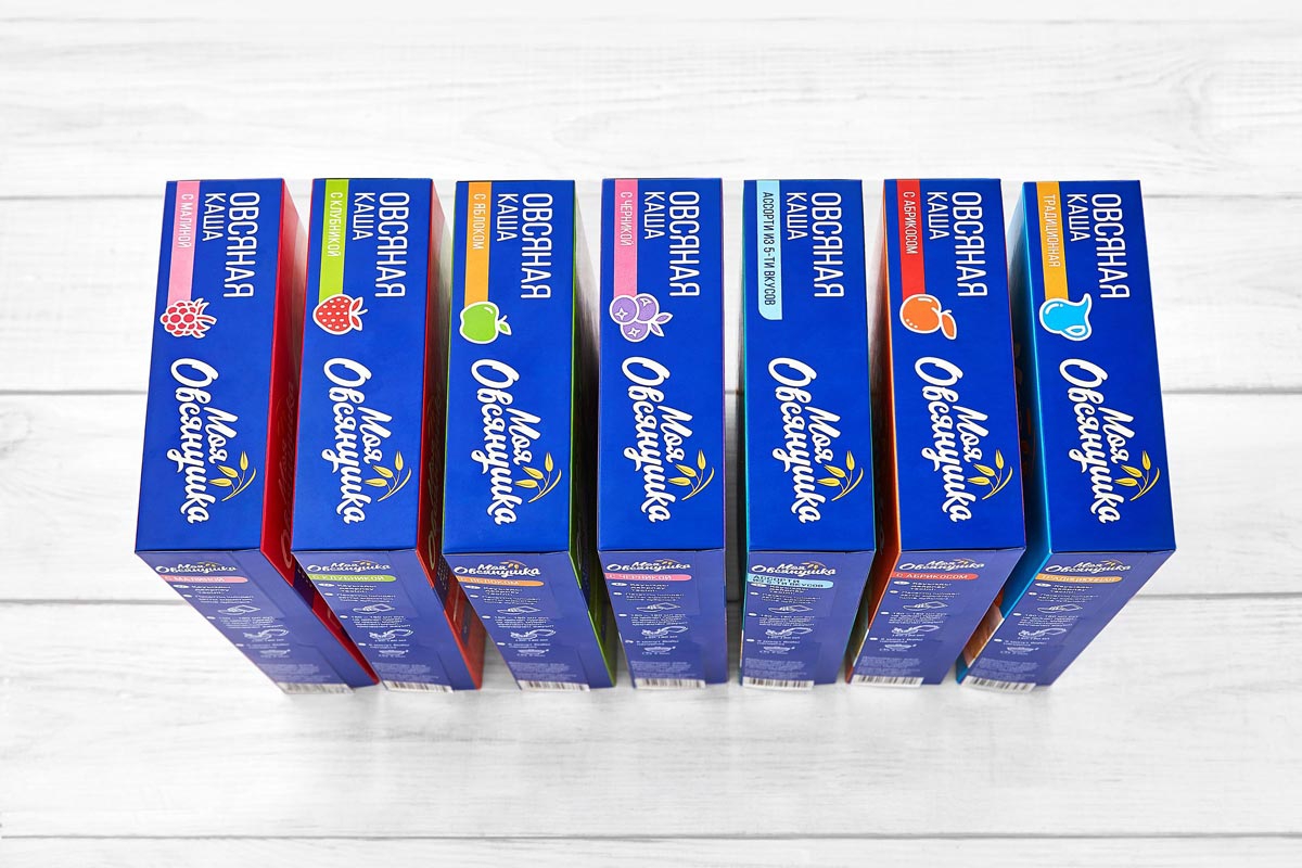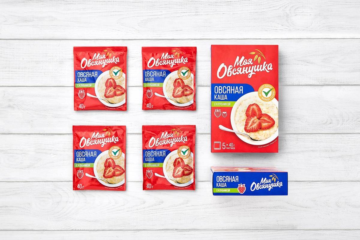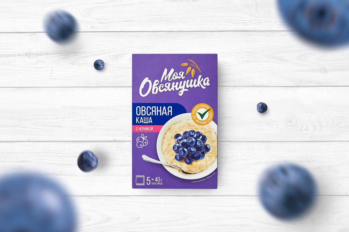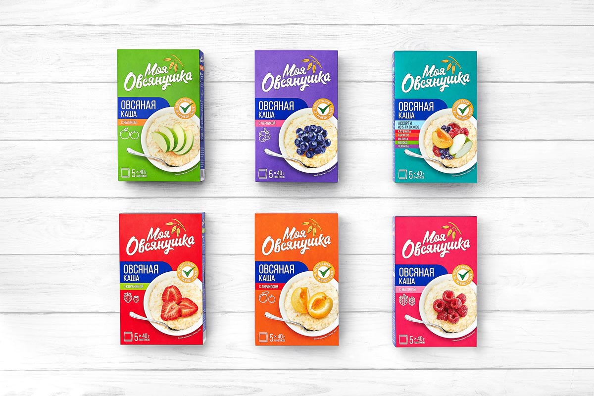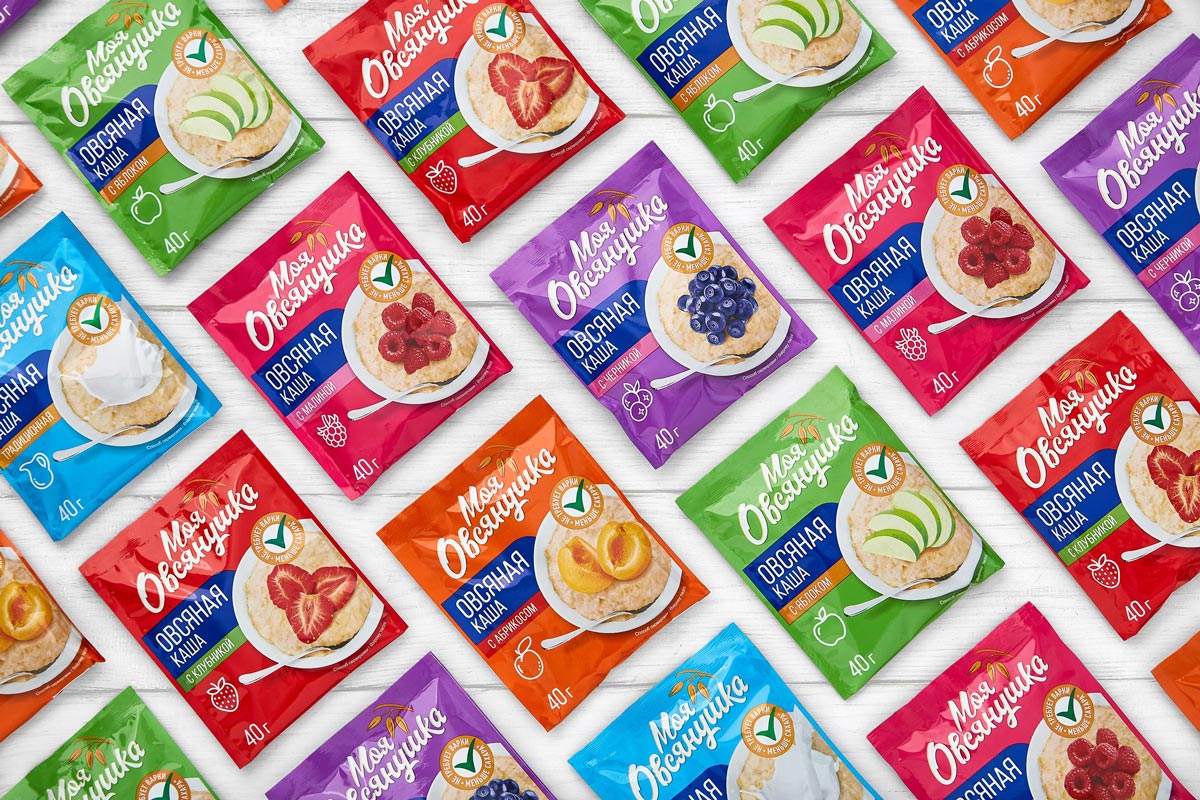 Нейм «Моя Овсянушка» отсылает к категории, вызывая добрые, нежные ассоциации. Это эмоциональное послание подкрепляет логотип, выполненный с использованием мягкого шрифта и графического элемента — колоса. Фудзона, декорированная аппетитными ягодами и фруктами, и яркое, чистое цветовое решение выделяют продукт на полке и работают на видовую отстройку.