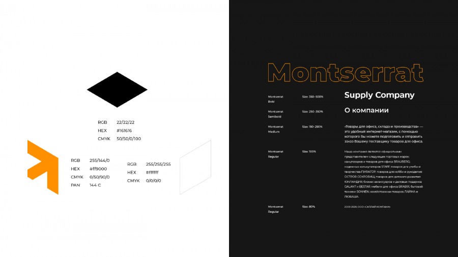 Фирменными цветами Supply Company стали оранжевый и черный, и дело не только в том, что их не использует никто их конкурентов. Важно значение цвета: оранжевый — цвет энергии, он олицетворяет смелость и силу бренда-наставника, а черный добавляет образу компании строгости и авторитета.