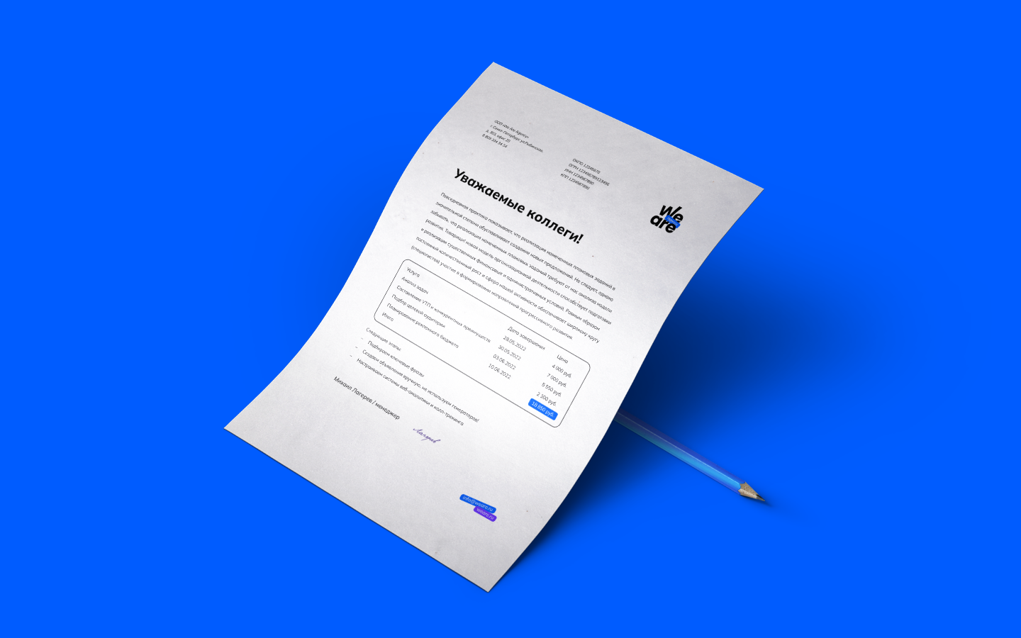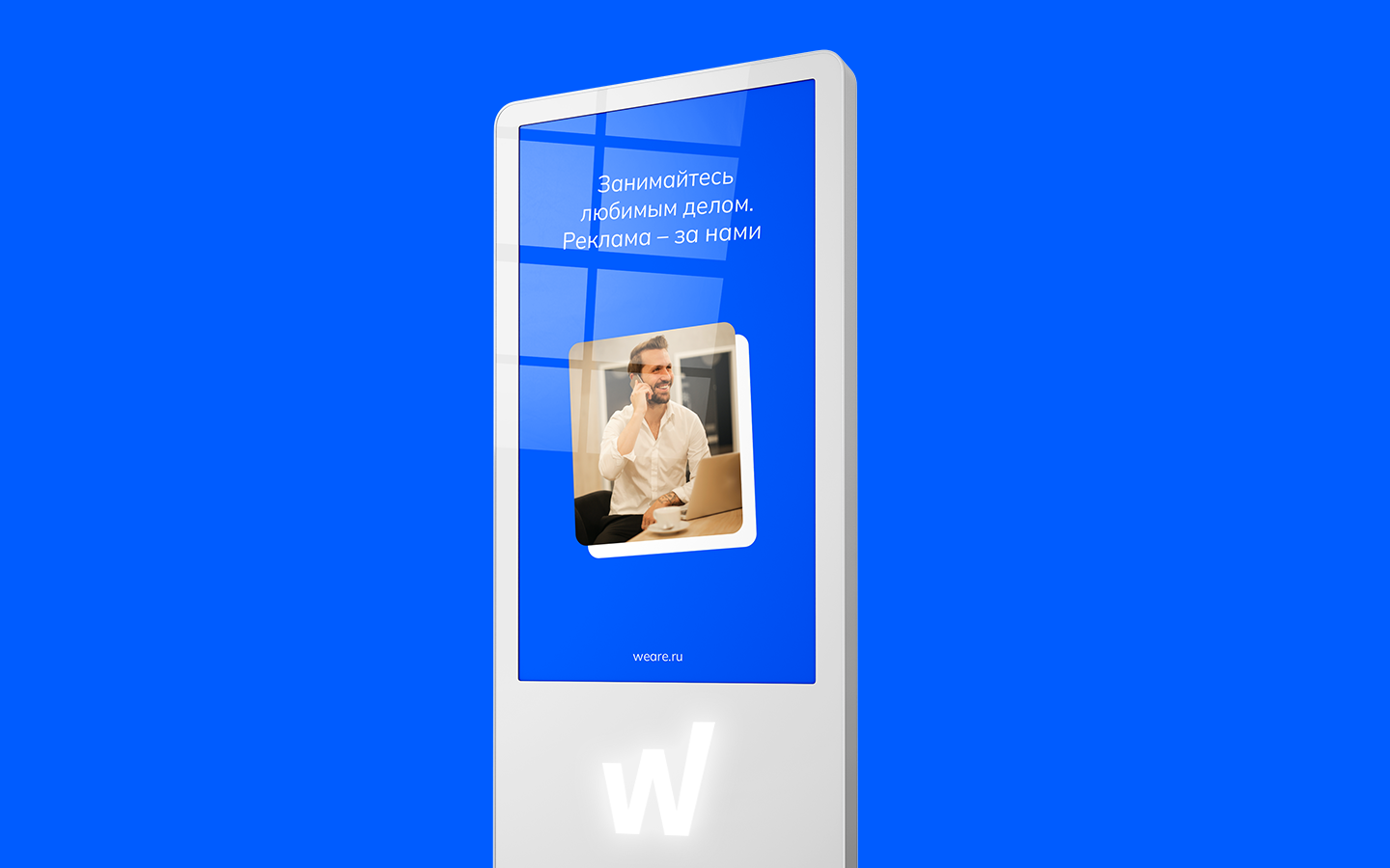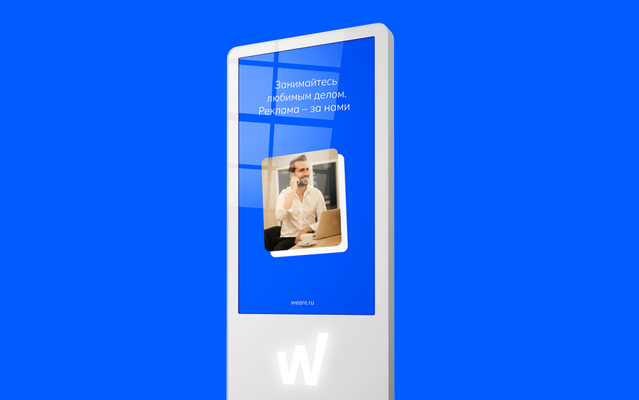 Мы изобразили букву «W» в виде графика, линия которого постоянно стремится вверх, как и само агентство. Чтобы текстовый логотип не смотрелся однообразно, между словами «We» и «Are» расположили дескриптор и сделали его частью фирменного стиля.