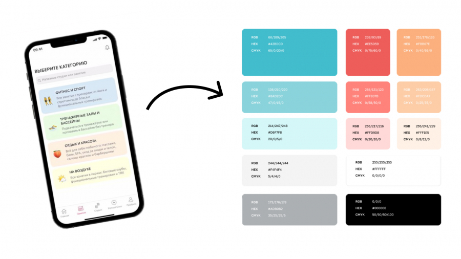 Перед тем, как приступить к разработке дизайна, мы выписали из приложения занятия, на которые могут сходить клиенты сервиса, и составила с ними карту ассоциаций. Это удобный инструмент для поиска нужного образа, который будет отражать через айдентику идею бизнеса клиента.