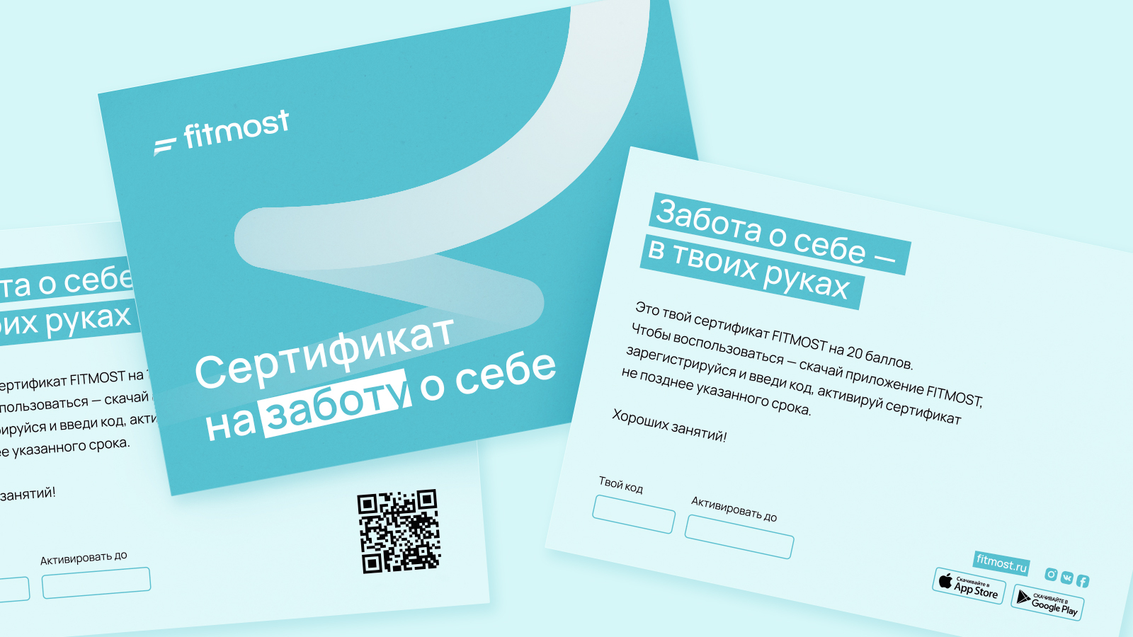 Бонусом к основному проекту мы задизайнили подарочные сертификаты сервиса. Текст на них набран двумя другими фирменными шрифтами Fitmost: Manrope и RF Tone.