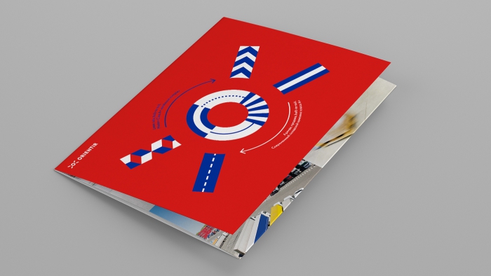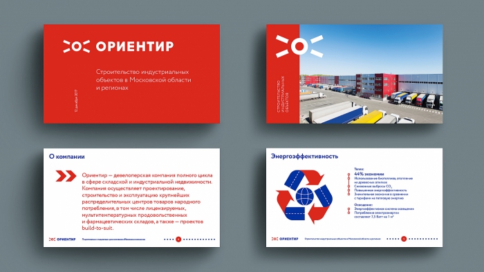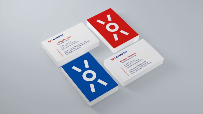 Фирменный стиль нового бренда выделяется на фоне графического оформления, привычного для отрасли индустриальной недвижимости. Центром нового логотипа является лаконичный и эффектный знак, в котором угадывается несколько ярких образов: «Ориентир» – это и источник света, и маяк, и победоносно вскинутые вверх руки. Мощное, контрастное сочетание фирменных цветов обновленного бренда – красного и яркого синего – отражают энергичность и напор девелопера.