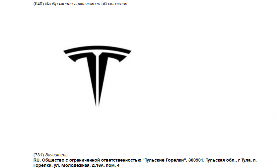 Производитель газовых горелок «Тульские горелки» регистрирует торговый знак, похожий на логотип компании Tesla. Соответствующую заявку на сайте Федерального института промышленной собственности обнаружили «Открытые медиа».