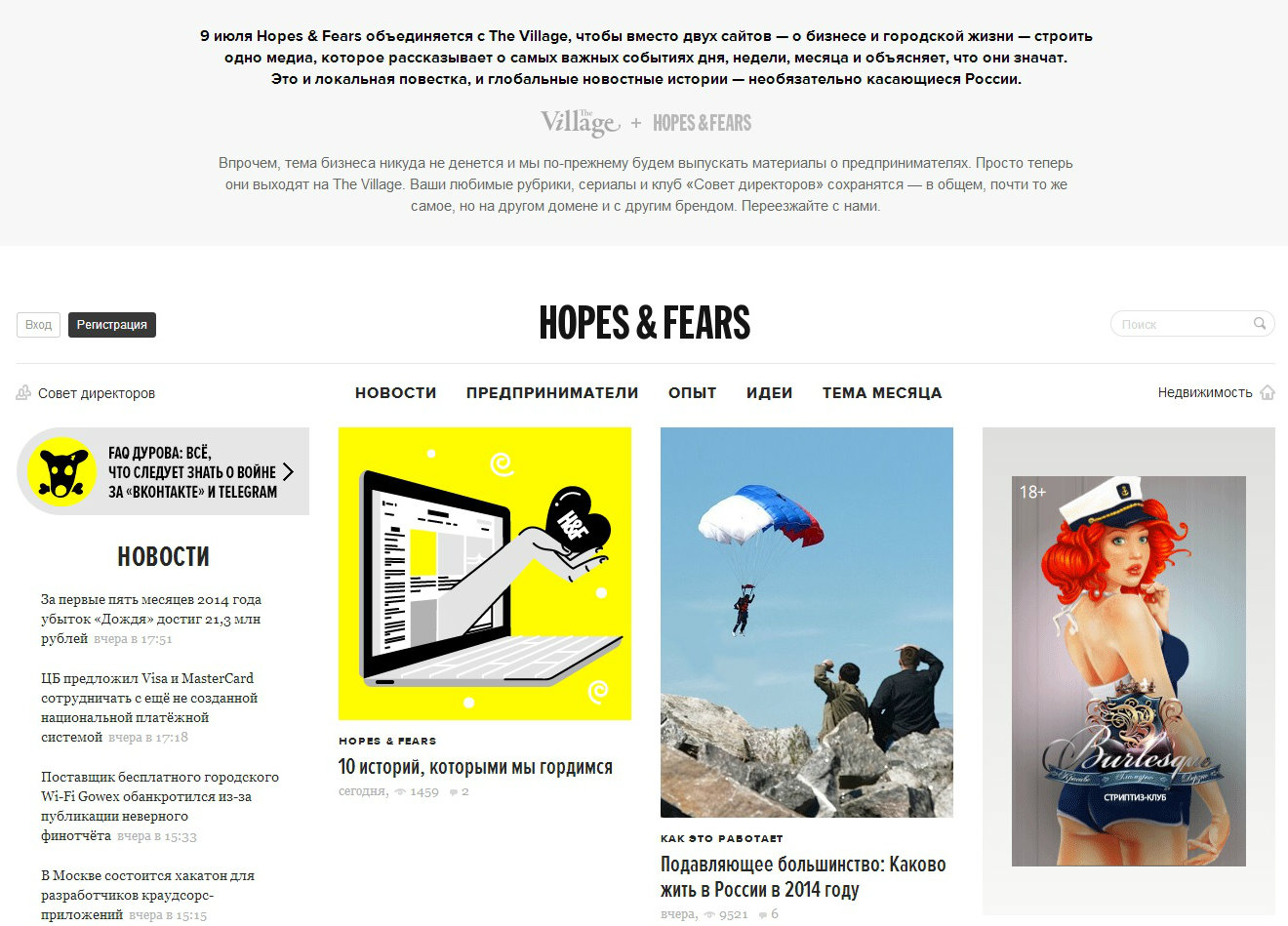 Медиахолдинг Look At Media (Look At Me, The Village, FURFUR, Hopes & Fears и Wonderzine) переносит интернет-издание Hopes & Fears на платформу The Village. С 9 июля проекты станут единым СМИ под брендом The Village, сообщается на сайте Hopes & Fears.