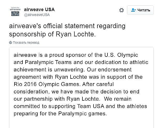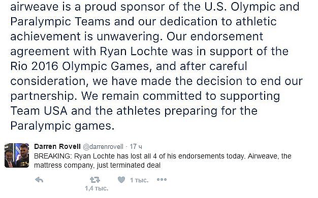 Сразу несколько спонсоров решили отказаться от сотрудничества с американским пловцом Райаном Лохте. Партнеров возмутило неспортивное поведение атлета, а именно ложные обвинения в ограблении. Скандал разразился на прошлой неделе, когда Лохте заявил, что он сам, а также три члена сборной США по плаванию стали жертвами вооруженного ограбления. Однако выяснилось, что история была выдумана. Бразильская полиция предъявила видеозапись с камер наблюдения, на которой видно, что неподобающе себя ведут именно американцы.