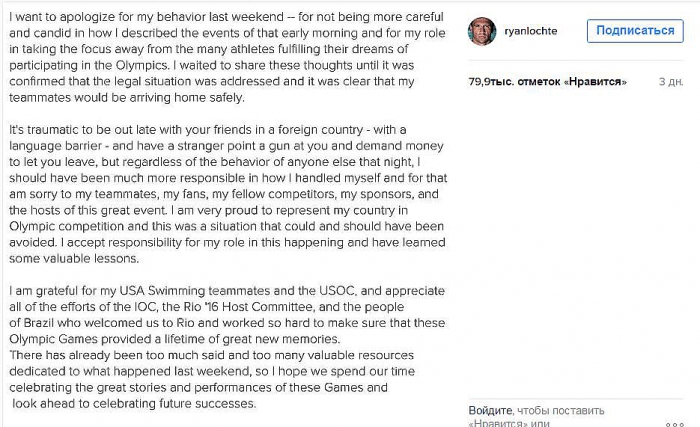 Лохте успел вернуться в Штаты, а его коллег Джека Конгера и Гуннара Бентца задержали в аэропорту. Против Лохте и еще одного пловца, Джеймса Фейгена, выдвинуты обвинения — их подозревают в ложном сообщении о преступлении. Олимпийский чемпион извинился за свое поведение и взял на себя ответственность за произошедшее. «Я получил несколько важных уроков», - написал спортсмен. Извинения бразильскому народу и организаторам Олимпиады принес и глава Олимпийского комитета США Скотт Блэкмун.