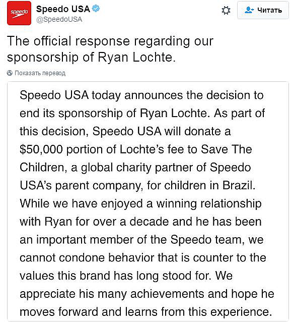 Компания Speedo USA объявила о прекращении спонсорства и намерении пожертвовать 50 тысяч долларов благотворительному фонду Save The Children для помощи бразильским детям. «Мы не можем потворствовать поведению, которое противоречит ценностям, долгое время поддерживаемым брендом», - сообщил производитель спортивной экипировки. Лохте поблагодарил спонсора за многолетнее сотрудничество и отметил, что уважает его решение.
