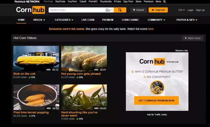 Порносайт pornhub.com превратился в cornhub.com, где дают жару с самой горячей кукурузой. Впрочем, долго наслаждаться дымящимся початком не получится — через несколько секунд произойдет редирект, и придется все-таки смотреть порно.