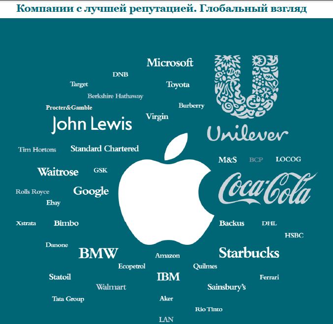 Лидером по числу упоминаний оказался бренд Apple, получивший мировое признание за стабильное качество и простоту. Компании удалось создать продукты, которые упрощают людям самые разные виды деятельности. Лучшими с точки зрения корпоративной репутации являются и Coca-Cola, Unilever, John Lewis, Олимпийский оргкомитет (LOCOG), BMW, Starbucks. В частности, эксперты отметили Unilever за разработку долгосрочной стратегии, сочетающей концепцию устойчивого развития и социальную ответственность.