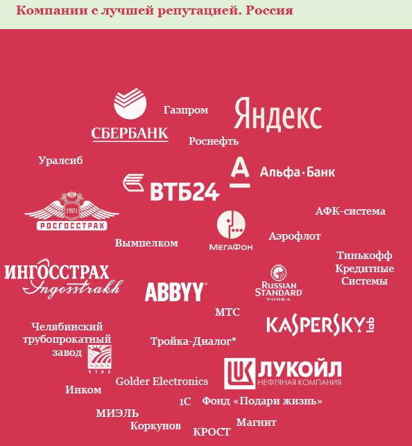 Члены репутационного совета из Северной Америки чаще называли глобально известные бренды, в Южной Америке – имена домашних компаний, а в Европе — компаний из B2B-сектора. Эксперты из России ставили на первое место высокотехнологичные бренды, а также отдавали дань уважения компаниям, которые смогли вырасти до международных. Исконно российский бизнес с лучшей репутацией принадлежит, в первую очередь, к сфере услуг (IT, финансовые услуги, сотовая связь) и в меньшей степени – к добывающим и производственным отраслям, ритейлу. Здесь в лидерах оказались «Яндекс», «МегаФон», Альфа-Банк, ВТБ24 и Сбербанк.