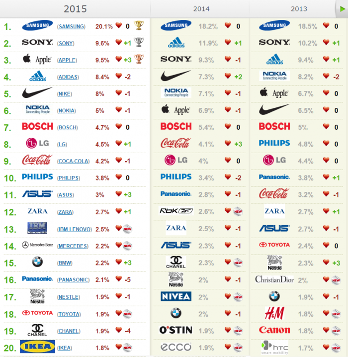 Лидер рейтинга - Samsung - является первым в категориях «Бытовая техника», «Электроника», «Сотовый телефон или смартфон». Apple, ставший третьим среди любимых, является вторым в категориях «Компьютерная техника», «Сотовый телефон или смартфон» и «Планшетный компьютер». Sony, ни разу не покидавший тройку лидеров в рейтинге любимых брендов, на этот раз оказался на втором месте ТОП-20.