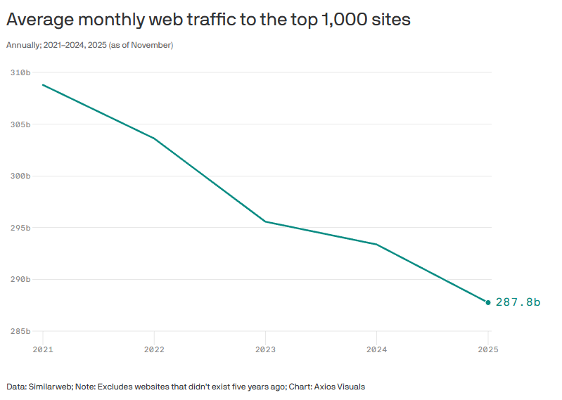 При этом общее использование интернета не сокращается. Совокупный трафик на 1 тыс. крупнейших сайтов в мире в среднем сохранялся на уровне около 300 млрд визитов в месяц, а в период с ноября 2024 по ноябрь 2025 года даже показал рост на 1,8%. Однако этот рост обеспечивают в основном новые платформы, тогда как «возрастные» сайты теряют позиции.