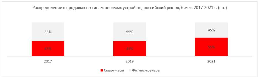 В первом полугодии текущего года 55% российского рынка в штучных продажах заняли «умные» часы — устройства впервые опередили фитнес-трекеры. В денежном объеме совокупная доля смарт-часов составила около 88%. Около 10% общего объема пришлось на детские часы, которые позволяют родителям отслеживать местоположение ребенка и оставаться с ним на связи.