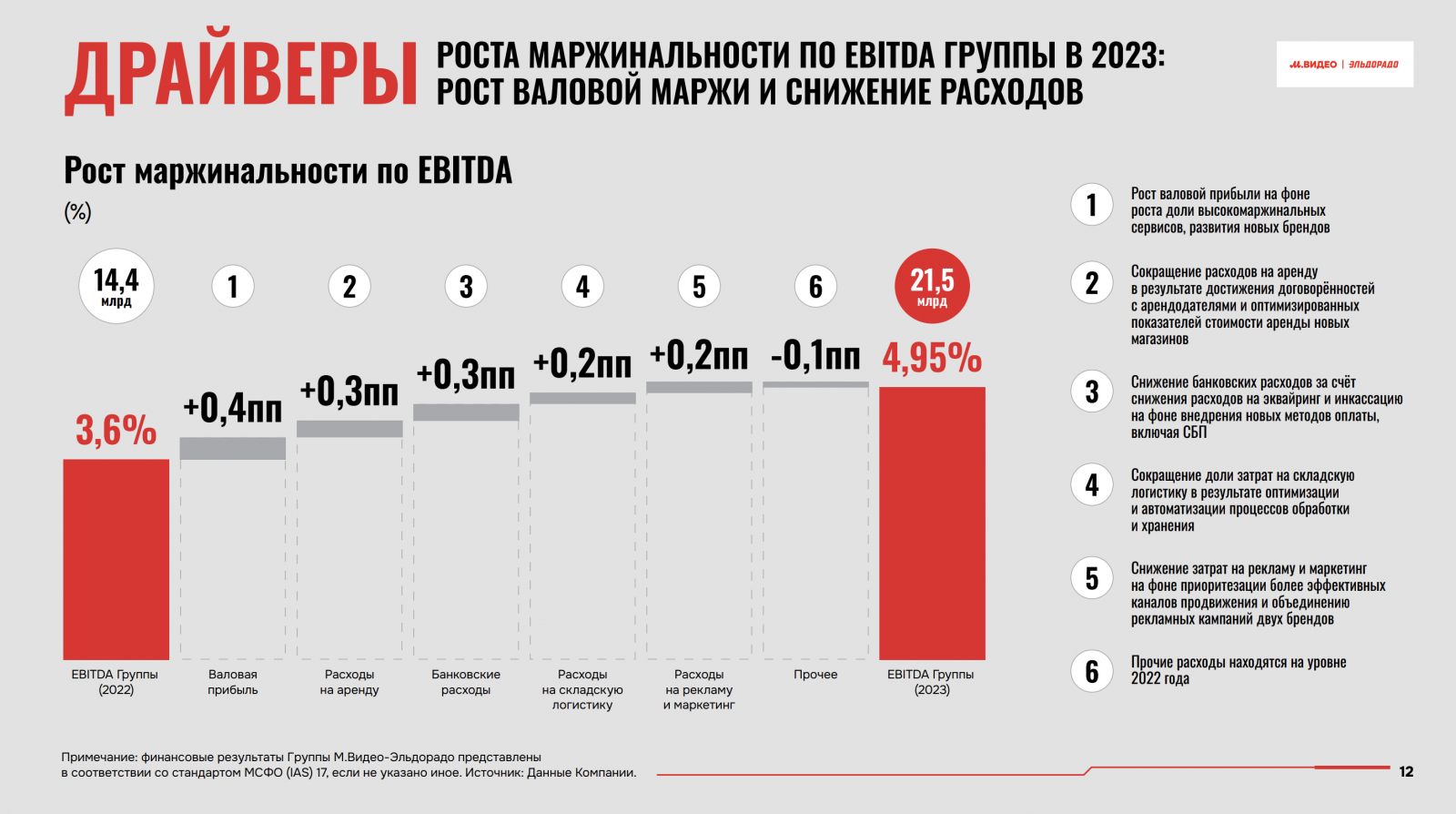 Показатель EBITDA группы в 2023 году составил 21,5 млрд руб. по сравнению с 14,4 млрд руб. годом ранее. EBITDA маржа увеличилась на 1,4 п.п. год к году и оказалась на уровне 4,95% в 2023 году вследствие «одновременного роста валовой маржи и сокращения доли операционных расходов к выручке». При этом в четвёртом квартале 2023 года показатель EBITDA вырос на 91%, а EBITDA маржа — на 1,8 п.п. до 6,7%, говорится в отчёте группы.