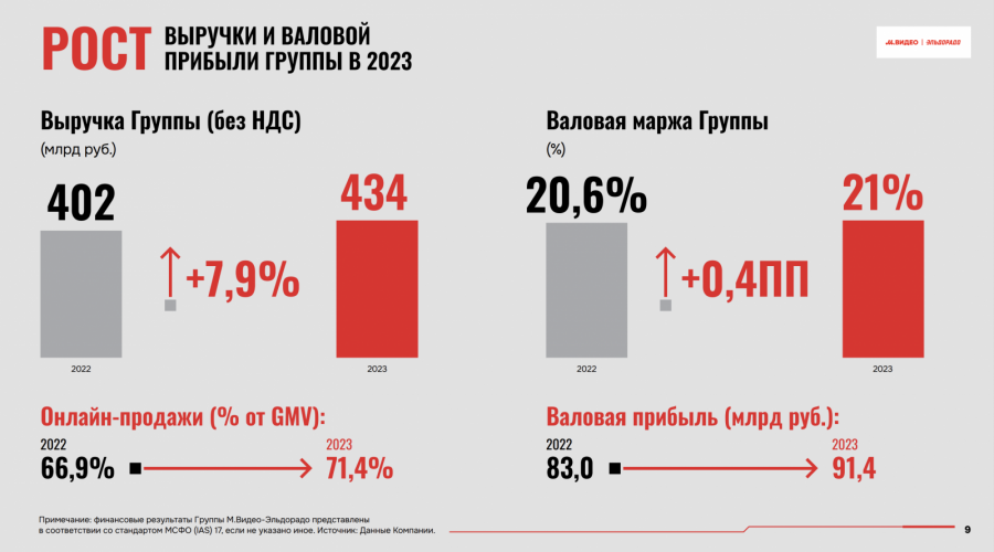 Группа «М.Видео-Эльдорадо» опубликовала финансовые итоги за 2023 год. Общие продажи (GMV) компании за отчётный период выросли на 11% год к году — до 540 млрд руб. Общие онлайн-продажи составили 71% GMV. Показатель увеличился на 18% — до 386 млрд руб.
