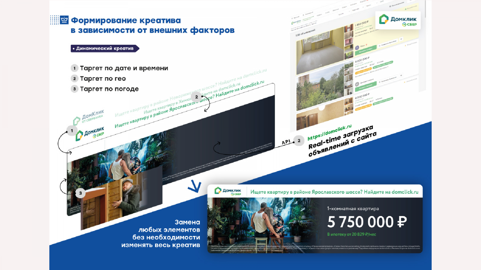 Изюминкой этой рекламной кампании в Maer называют динамический креатив. Каждый выход рекламного контента на экраны был уникален. Изображения собирались заново из готовых элементов с учётом факторов окружения: погоды, времени суток и того, какая группа преобладает сейчас в зоне видимости медиафасада. Прямо с портала «Домклик» на медиафасады загружались действующие объявления о продаже квартир с самой низкой ценой. Система настраивалась один раз, далее демонстрация креатива происходила в автоматическом режиме без вмешательства со стороны оператора.