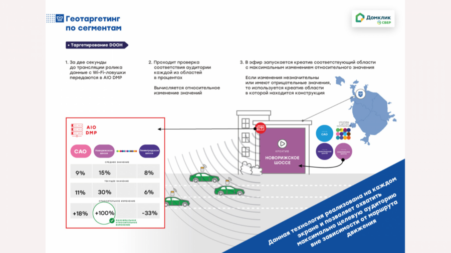«СберМаркетинг» в рекламной кампании сервиса для поиска, покупки, продажи и аренды недвижимости «Домклик», где задействовал одновременно четыре свои разработки: аналитику, таргетирование, динамический креатив и O2O-ретаргетинг. Представители медиахолдинга рассказали Sostav, как продвижение стало одним из самых технологически ёмких на рынке наружной рекламы в России.