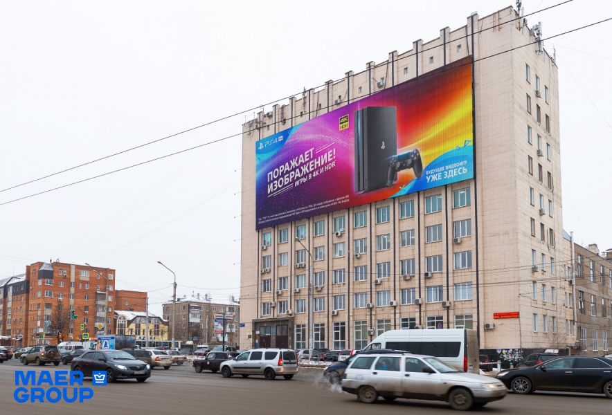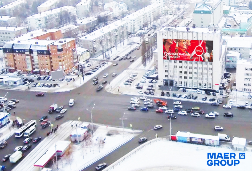 MAER GROUP , который постоянно расширяет свою сеть DOOH-носителей. Они позволяют воплощать любые творческие задумки: от трансляции важных государственных и спортивных событий до показа конкурса детских рисунков. О прямом назначении конструкции — рекламном — можно много не говорить, т.к. появление крупнейшего рекламного носителя всегда становится событием в жизни любого города. В Уфе, например, на появление DOOH-носителя сразу же откликнулись крупные российские и международные бренды. Как и любой фасад MAER GROUP, он оборудован Wi-Fi-снифферами технологии О2О.
