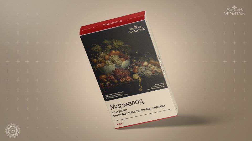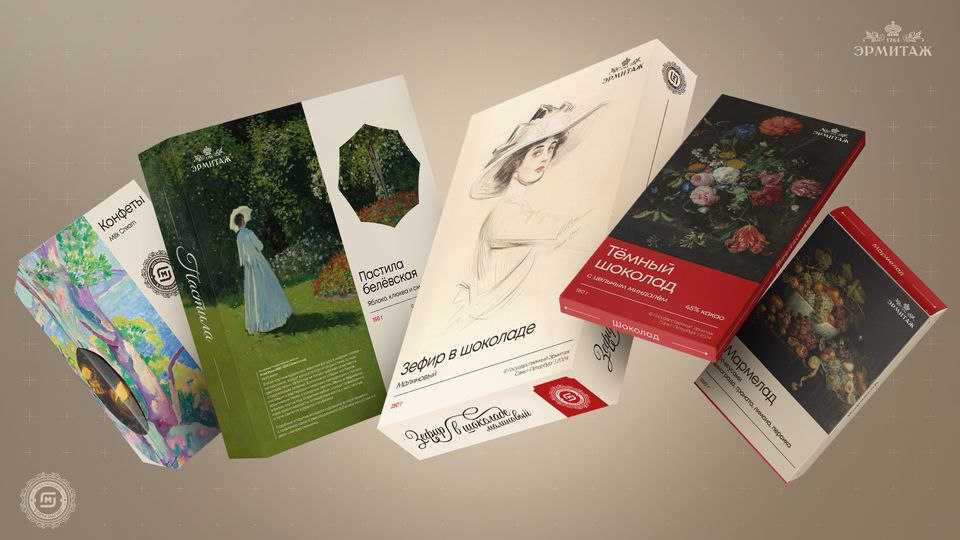 Ретейлер «Магнит» совместно с Эрмитажем представил эксклюзивную коллекцию кондитерских изделий. В нее вошли зефир, конфеты, шоколад, пастила и мармелад. В оформлении упаковок сладостей использованы элементы с картин великих мастеров из собрания музея: Поля Сезара Элле, Клода Моне, Адриана ван Утрехта, Анри-Шарля Мангена и Яна Давидса де Хема.