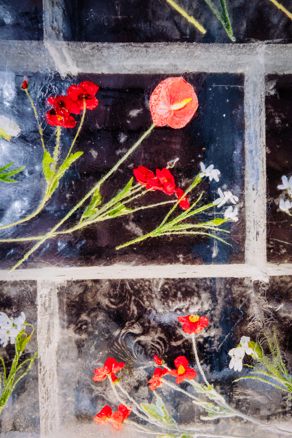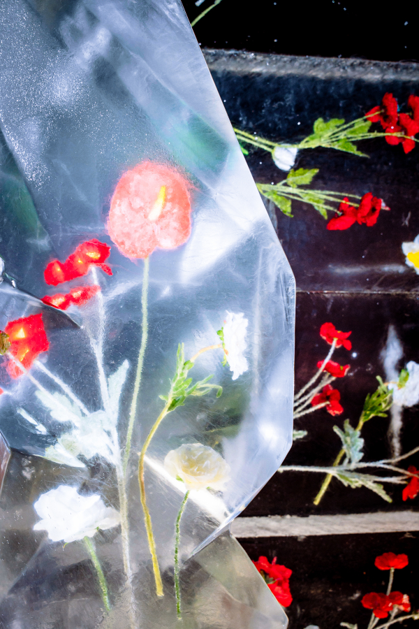 Ледяная композиция объединила в себе сразу две стихии: внутри прозрачного ледяного блока замерли нежные весенние бутоны. Это метафора миссии сервиса: доставить тепло и уют в любое время года, даже в самый разгар зимы.
