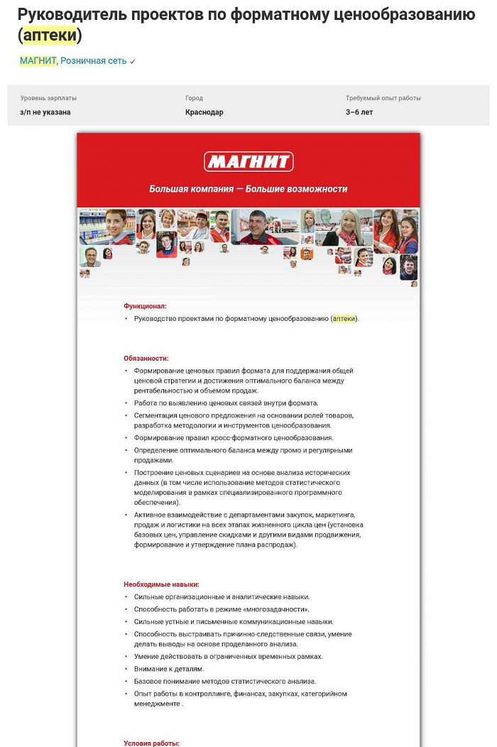 «Магнит» набирает персонал для нового формата - собственной аптечной сети. На сайте HeadHunter появились вакансии руководителя проектов по форматному ценообразованию аптек, заведующего, руководителя проекта по эталонам аптек, руководителя по обучению персонала, ответственного за мониторинг продаж. Все вакансии актуальны для Краснодара.