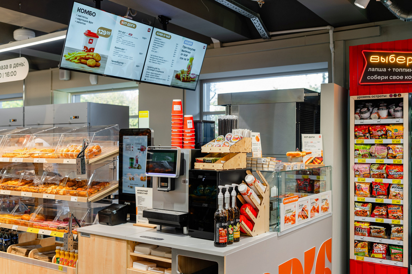В магазинах активно применяются цифровые решения: электронные шелф-баннеры, экраны с меню и визуальные подсказки, а фирменные герои — мастер, пекарь и руководитель — сопровождают покупателей, объясняя преимущества сети.