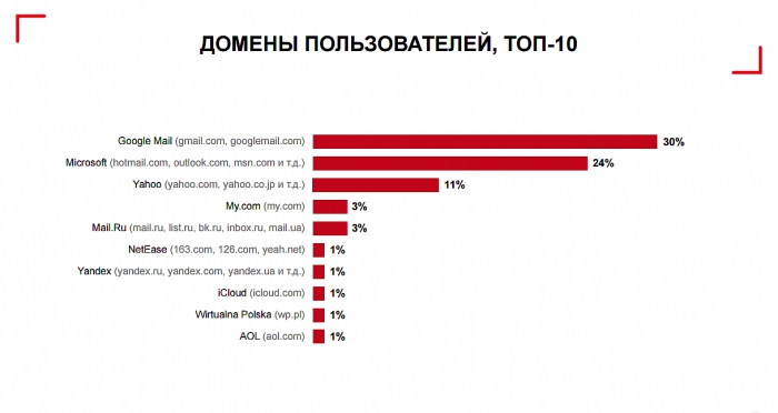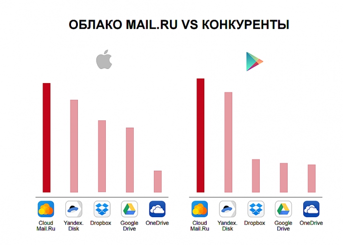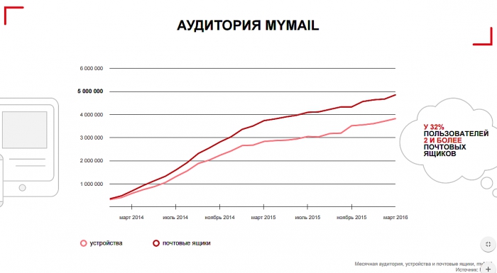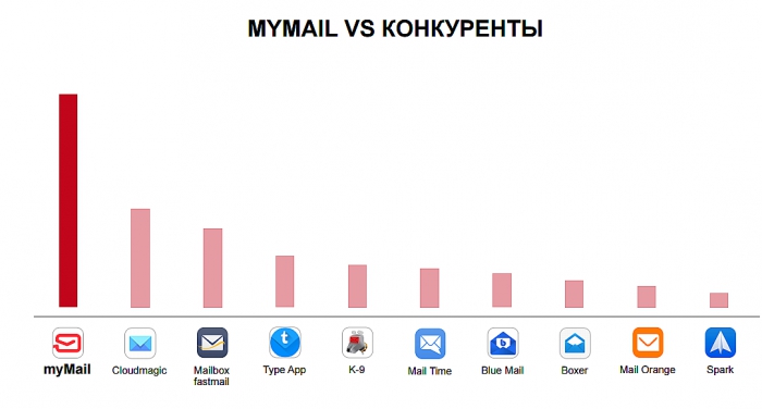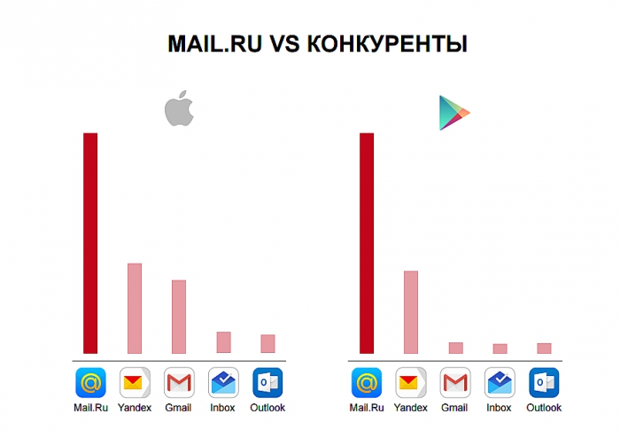 В App Store и Google Play в России в лидерах - приложения Почты Mail.Ru. Мобильная аудитория Почты Mail.Ru в марте 2016 года составила порядка 25 млн. пользователей, а аудитория myMail, самого популярного альтернативного клиента для iOS и Android в мире, - порядка 4 млн. пользователей.