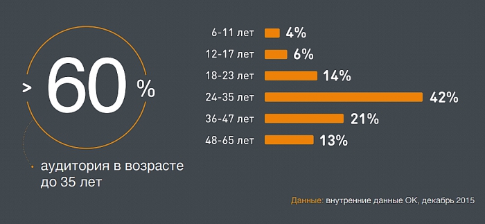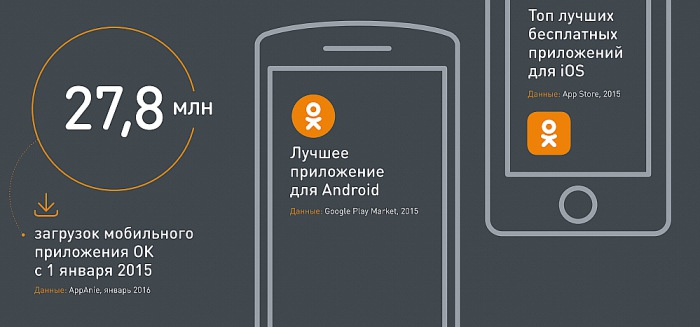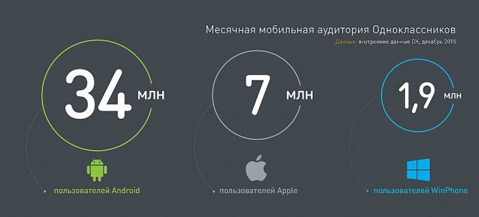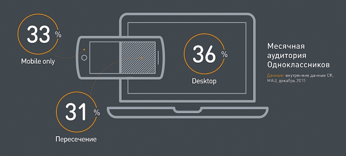Мобильная аудитория «Одноклассников» составляет 64% пользователей, отметил Антон Федчин, руководитель социальной сети Одноклассники. Месячная мобильная аудитория сети составляет 46,1 млн. пользователей, ежедневная дневная мобильная аудитория - 27 млн. пользователей.