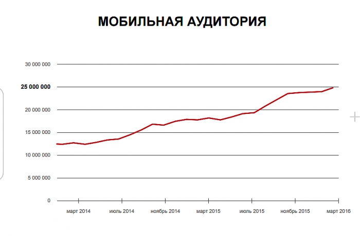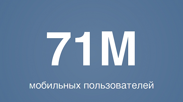 Мобильная аудитория социальной сети уже составляет 71 млн. пользователей. Это 77% от общей аудитории равной 90 млн уникальных пользователей в месяц. Исключительно через мобильные устройства в соцсеть заходят 25% пользователей. Пользователь в среднем потребляет 100 записей в сутки и проводит в мобильном приложении «Вконтакте» 22 минуты ежедневно.