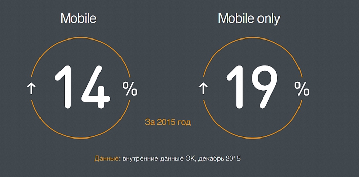 При этом только через mobile в «Одноклассники» заходят 33% от всей аудитории (сегмент вырос на 19% по сравнению с прошлым годом). В целом, в 2015 году заходить в соцсеть через mobile пользователи стали на 14% больше, чем в 2014 году.