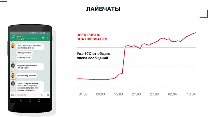 Так, 85% пользователей «ВКонтакте» отправляют друг другу сообщения (на мобильных устройствах, как отметил Рогозов, процент еще выше: переписываются друг с другом 9 из 10 пользователей). Ежедневно ВКонтакте доставляется 5 млрд сообщений — это больше, чем среднесуточное количество SMS, доставляемых всеми российскими операторами связи. 800 тыс. сообществ компаний и брендов отвечают на вопросы своих клиентов в личных сообщениях социальной сети.