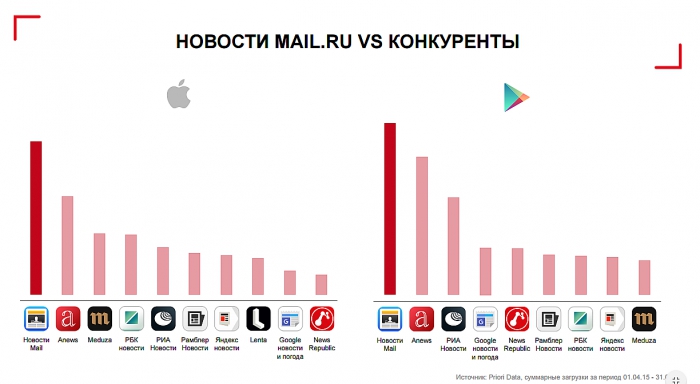 Mail.Ru Group, как отметил Гришин, уже занимает первое место по дневной мобильной аудитории в России, при этом Россия входит в пятерку мировых лидеров по установкам приложений на iOS и в Google Play. Самыми популярными приложениями Mail.Ru Group являются социальные сети, мессенджеры, почта, игры и карты – все перечисленные продукты занимают лидирующие позиции на интернет-рынке в России.