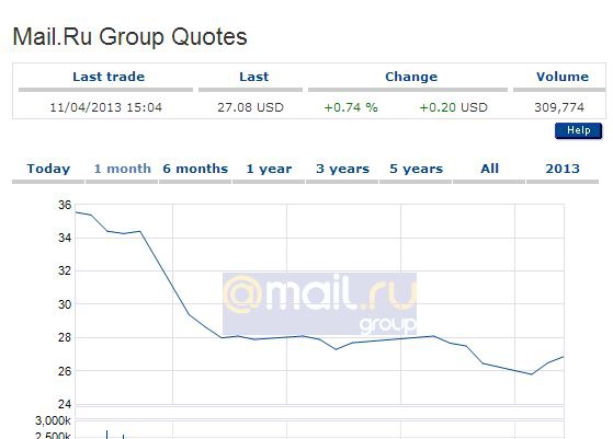 Стоимость акций интернет-компании приблизилась к историческому минимуму. Mail.Ru Group вышла на биржу осенью 2010 года, и в течение 2011-го стоимость ее акций трижды оказывалась ниже отметки в 25,8 доллара.