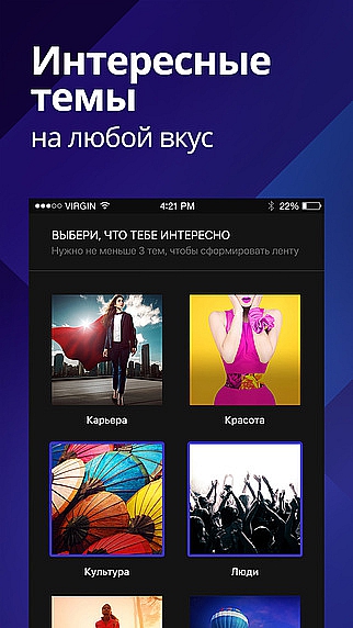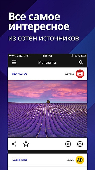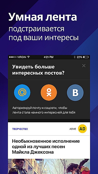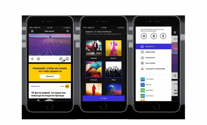 Пользователю достаточно открыть приложение, чтобы увидеть свежие публикации на интересующие его темы. Лента рекомендаций начинает формироваться при первом запуске, когда Likemore предложит выбрать интересные рубрики из 13 возможных. Кроме того, к приложению можно подключить аккаунт во «ВКонтакте», «Одноклассниках» или «Почте Mail.Ru», тогда будет учитываться онлайн-активност