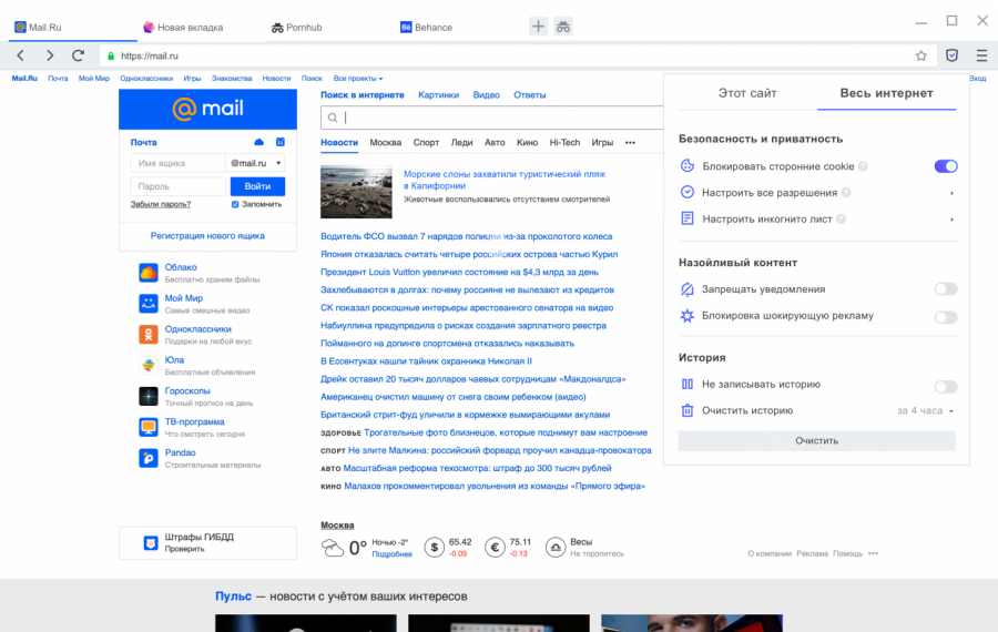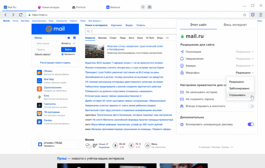 На панели можно быстро проверить, какие важные разрешения выданы конкретному сайту, и изменить эти настройки для конкретного ресурса или для всего интернета. Например, можно запретить получение доступа к камере и микрофону, а также запись кук третьих сторон (например, рекламных сетей). Также можно в один клик блокировать раздражающую рекламу и навязчивые предложения подписаться на уведомления от сайтов.