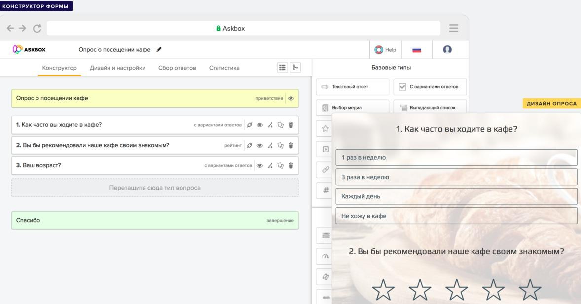 При конструировании опросов доступны более 20 типов форм. gДля их создания и проведения тестирования в сервисе опросов можно использовать стандартные или собственные шаблоны; все элементы дизайна можно брендировать.