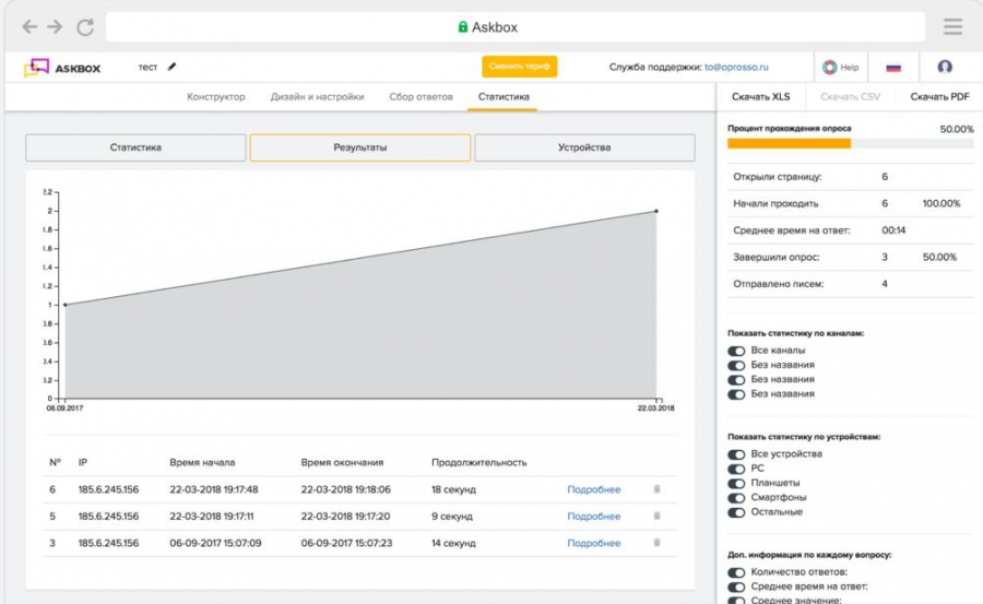 Опрашивать пользователей можно по всем популярным каналам коммуникации: в социальных сетях, по SMS, электронной почте и других. Также сервис позволяет создавать формы обратной связи и регистрационные формы и интегрировать их в различные CRM- и ERP-системы. Результаты из этих источников агрегируются в наглядную аналитику в виде графиков и таблиц.