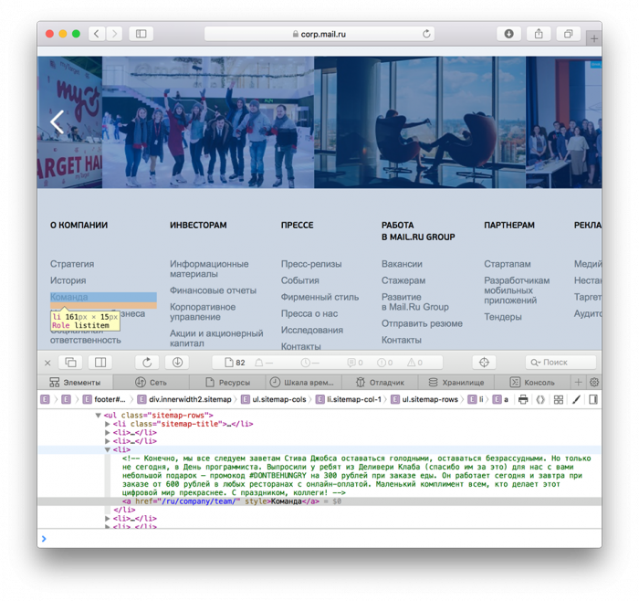 Компания Mail.ru Group приготовила ко Дню программиста пасхалку с секретным поздравлением. Оно спрятано в исходный код корпоративного сайта, и найти его без труда получится не у всех.