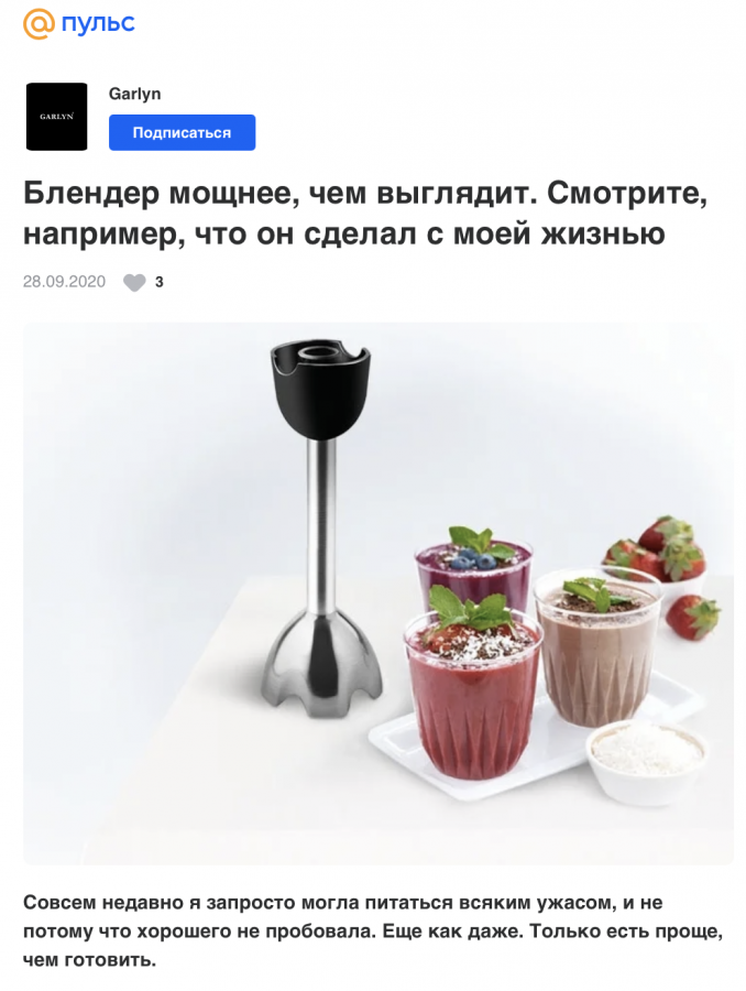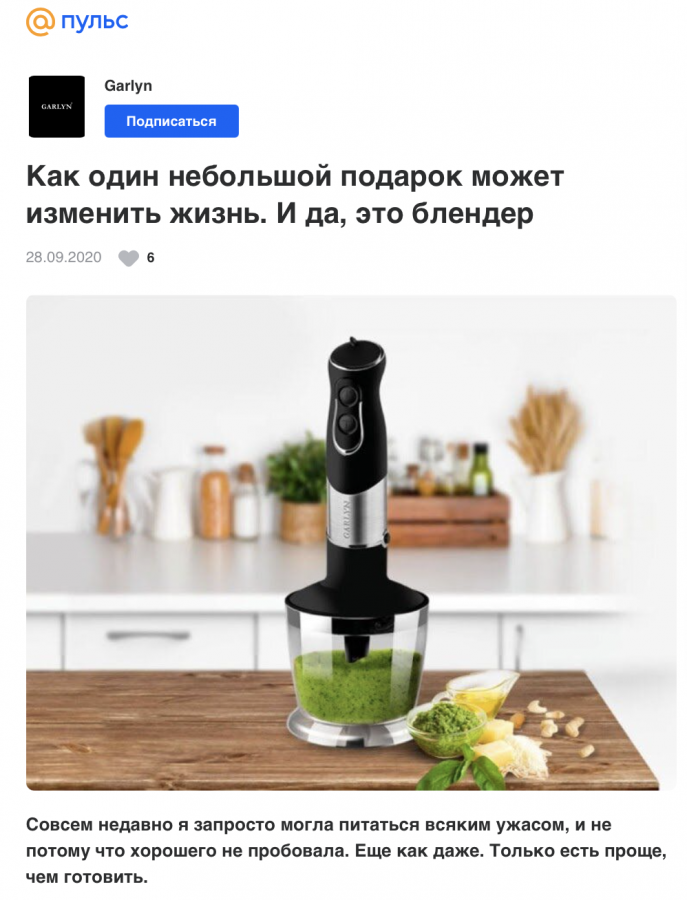 Российский производитель бытовой техники Garlyn запустил промо в «Пульсе», рекомендательной платформе Mail.ru Group. Разработкой продвижения занималось интернет-агентство «Медиасфера». Внимание пользователей привлекали яркими заголовками, обложками, интригующим вступлением. Команда опробовала разные форматы, прежде чем смогла выделить то, что интересно будущим покупателям. О конверсиях при помощи лид-магнита, и как отсекалась нецелевая аудитория, Sostav рассказал коллектив компании.