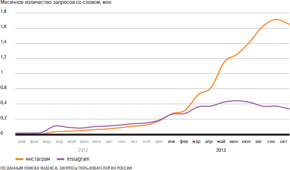 Ещё одно знаковое слово из интернет-реальности 2013 года – «Инстаграм». В 2013-м русское название сервиса окончательно победило английское. Другие сервисы и приложения, названия которых всё чаще ищут в поиске: онлайн-редактор фотографий Аватан, мобильные интернет-мессенджеры WhatsApp и Viber, музыкальные онлайн-открытки Плейкаст. Единственное популярное новое слово, обозначающее предмет не из виртуальной реальности, — это мультиварка. Появилось оно относительно давно, но настоящую популярность начало набирать в конце прошлого – начале текущего года.